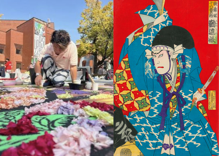 花絵師 藤川靖彦がオープニング前日に、独自のカラーサンド(色砂)技法で10㎡の大作 歌川国貞による名作「歌舞伎十八番之内 勧進帳」を公開制作、会期中観覧できます。